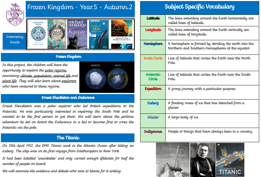 This term, Year 5 focus on 'Frozen Kingdom', where we will explore significant polar explorers, including Robert Falcon Scott, Ernest Shackleton, Roald Amundsen and Ranulph Fiennes. Year 5 have created some excellent biographies to showcase their research skills and demonstrate what they have learnt about these significant individuals.