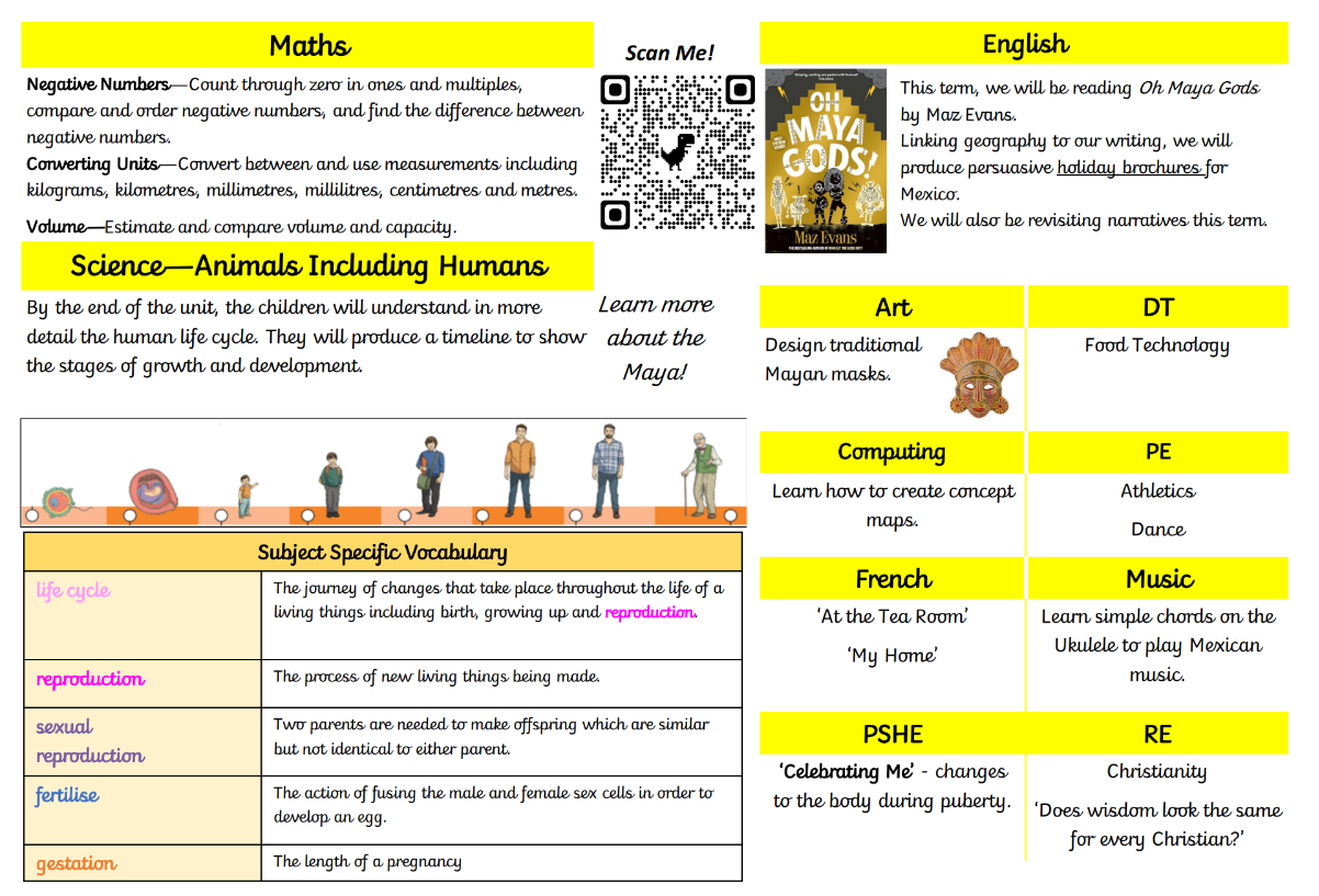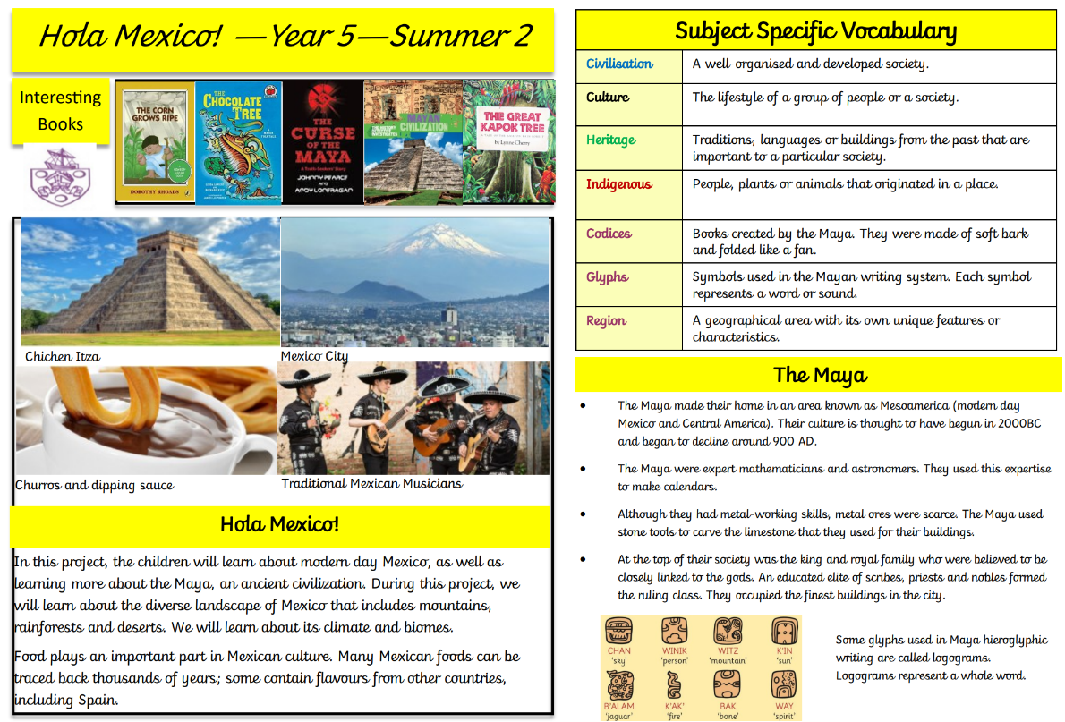 During the Summer Term, the children's project is 'Hola Mexico!' in which they learn about modern day Mexico as well as learning about the Maya. The children learn about the ancient Mayan civilisation, focusing on what life was like during this period in history and also the impact it had on future generations. We will also find out about the Mexican terrain, its climate and biomes. In D.T we learn about Mexican food, and design some of our own dishes with Mexican flavours!